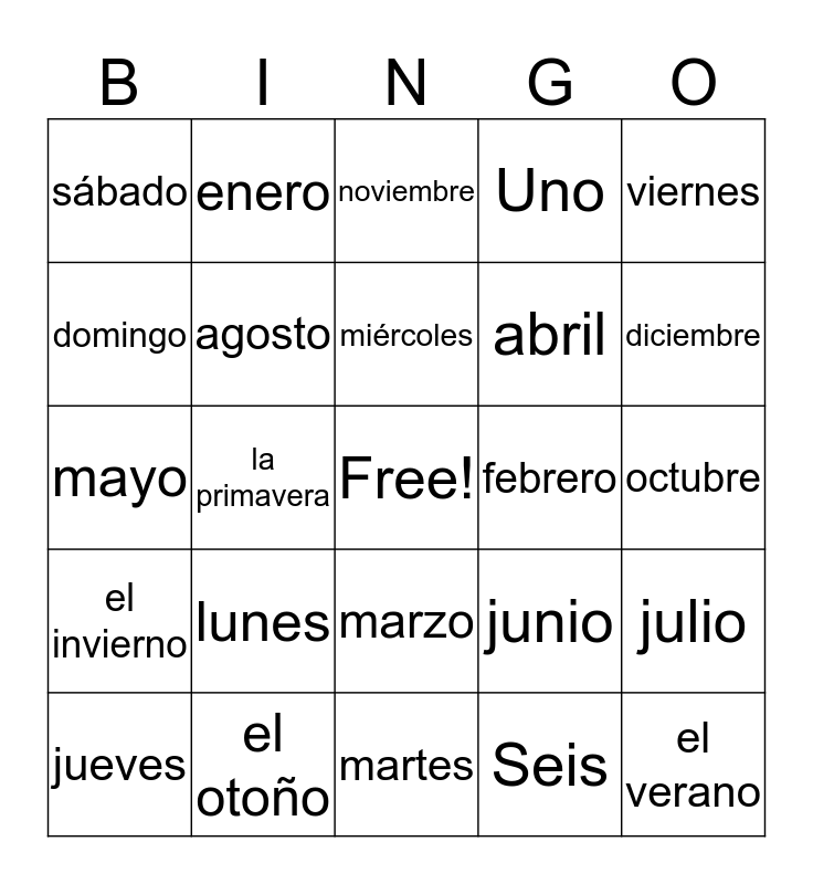 This bingo card has a free space and 25 words: lunes, martes, miércoles, jueves, viernes, sábado, domingo, enero, febrero, marzo, abril, mayo, junio, julio, agosto, septiembre, octubre, noviembre, diciembre, la primavera, el verano, el otoño, el invierno, Uno and Seis.
