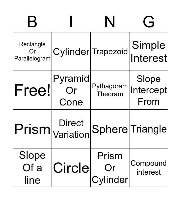 This bingo card has 16 words: Circle, Triangle, Trapezoid, Rectangle Or Parallelogram, Prism, Cylinder, Sphere, Prism Or Cylinder, Free!, Pyramid Or Cone, Slope Of a line, Simple Interest, Direct Variation, Slope Intercept From, Pythagoram Theoram and Compound interest.