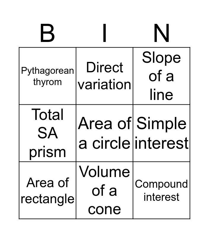This bingo card has a free space and 8 words: Simple interest, Slope of a line, Direct variation, Area of rectangle, Pythagorean thyrom, Compound interest, Total SA prism and Volume of a cone.