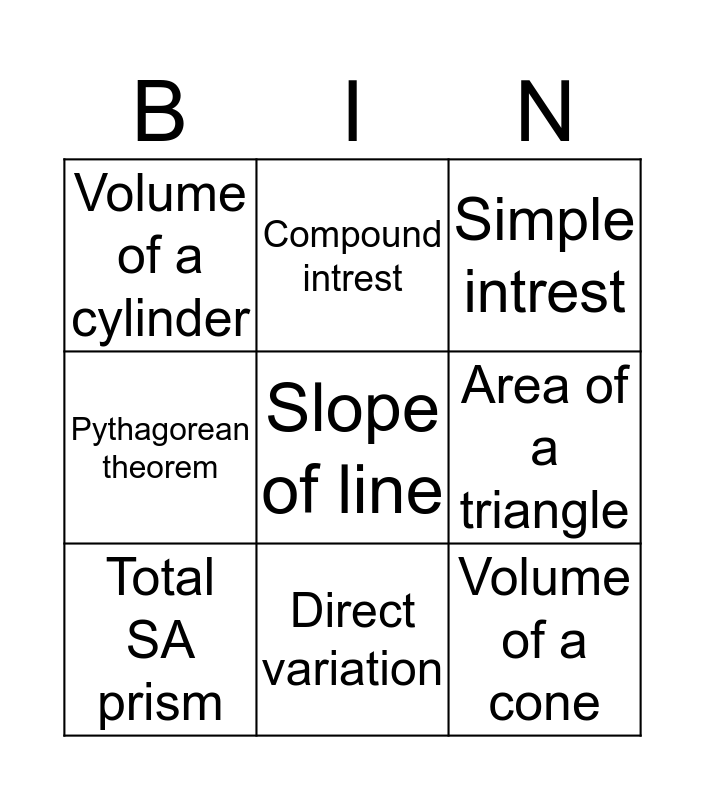 This bingo card has a free space and 8 words: Area of a triangle, Simple intrest, Compound intrest, Total SA prism, Volume of a cylinder, Volume of a cone, Pythagorean theorem and Direct variation.