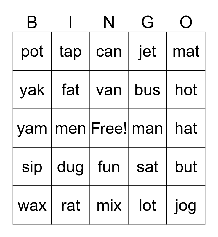 This bingo card has a free space and 24 words: dug, rat, van, wax, mat, pot, yak, tap, man, fun, bus, yam, sat, but, fat, lot, hat, can, hot, men, jog, sip, jet and mix.
