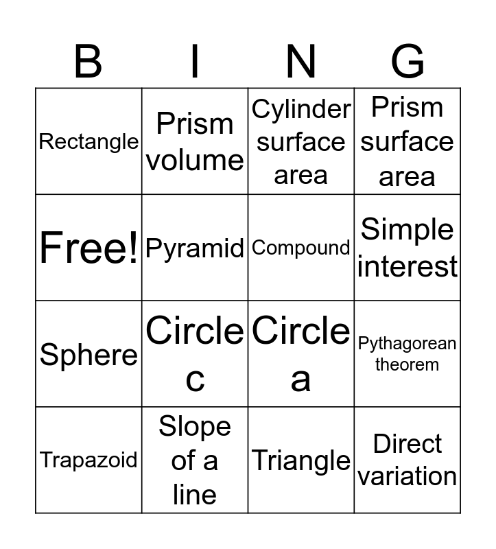 This bingo card has 16 words: Slope of a line, Pythagorean theorem, Cylinder surface area, Rectangle, Sphere, Prism volume, Circle a, Triangle, Free!, Pyramid, Trapazoid, Prism surface area, Circle c, Simple interest, Compound and Direct variation.