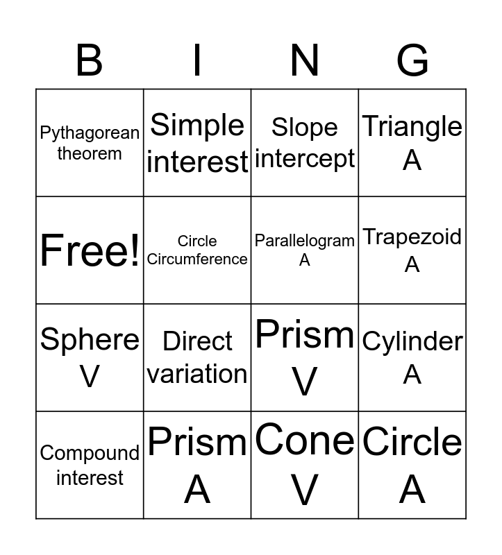 This bingo card has 16 words: Prism A, Cylinder A, Slope intercept, Pythagorean theorem, Sphere V, Simple interest, Prism V, Cone V, Free!, Circle Circumference, Compound interest, Triangle A, Direct variation, Trapezoid A, Parallelogram A and Circle A.