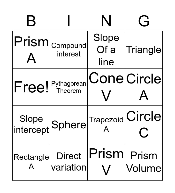 This bingo card has 16 words: Direct variation, Circle C, Slope Of a line, Prism A, Slope intercept, Compound interest, Trapezoid A, Prism V, Free!, Pythagorean Theorem, Rectangle A, Triangle, Sphere, Circle A, Cone V and Prism Volume.