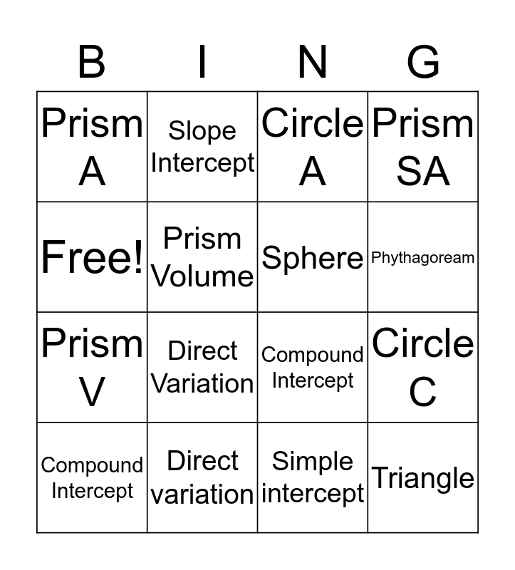 This bingo card has 16 words: Direct variation, Circle C, Circle A, Prism A, Prism V, Slope Intercept, Compound Intercept, Simple intercept, Free!, Prism Volume, Compound Intercept, Prism SA, Direct Variation, Phythagoream, Sphere and Triangle.