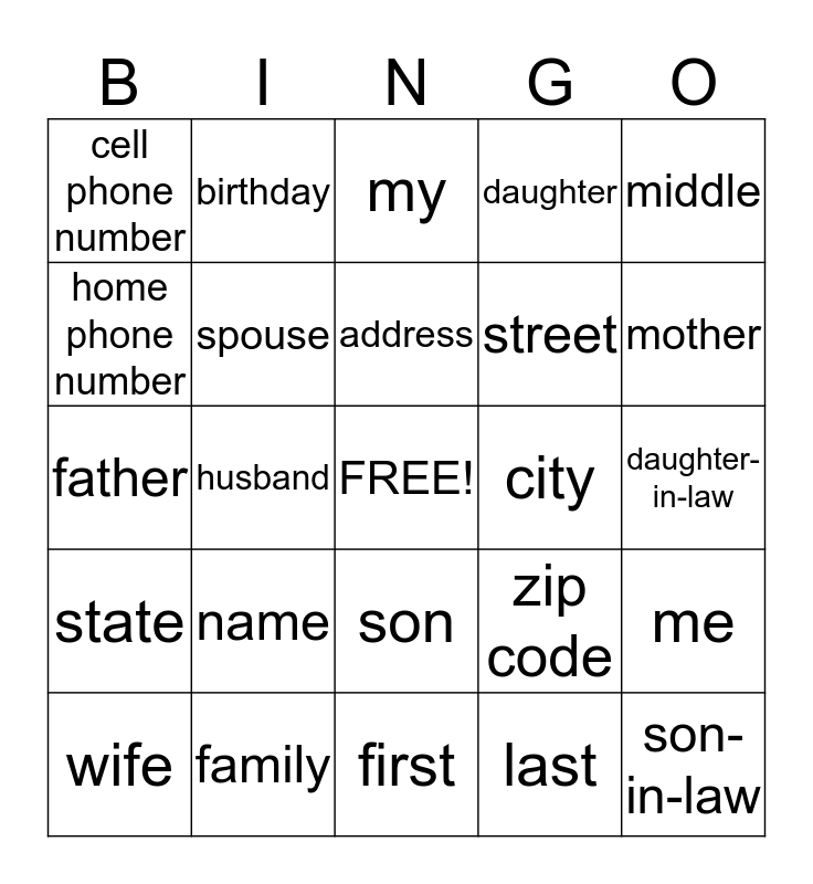 This bingo card has a free space and 24 words: name, family, address, wife, middle, cell phone number, home phone number, birthday, city, son, street, father, zip code, me, spouse, last, daughter-in-law, my, mother, husband, son-in-law, state, daughter and first.