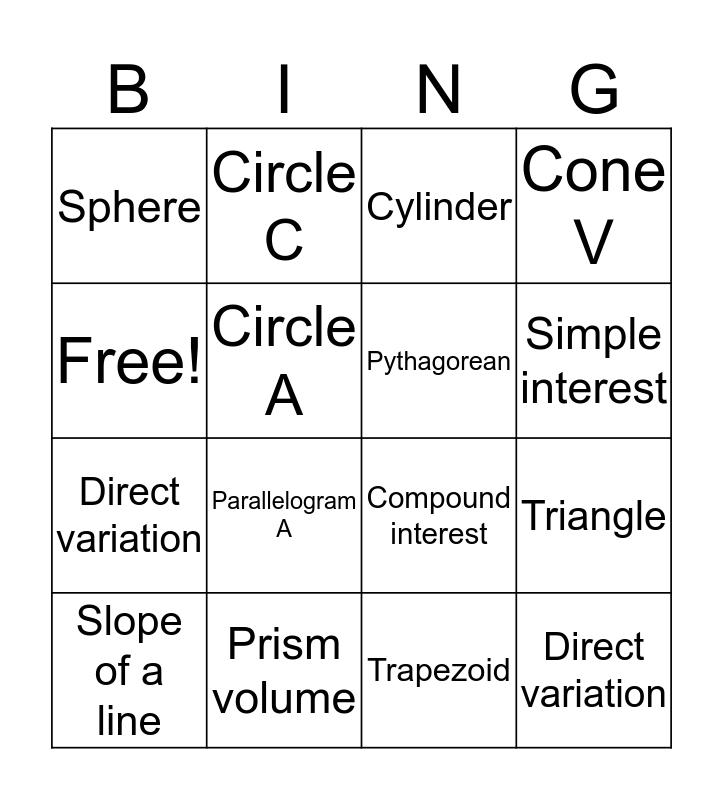 This bingo card has 16 words: Prism volume, Triangle, Cylinder, Sphere, Direct variation, Circle C, Compound interest, Trapezoid, Free!, Circle A, Slope of a line, Cone V, Parallelogram A, Simple interest, Pythagorean and Direct variation.