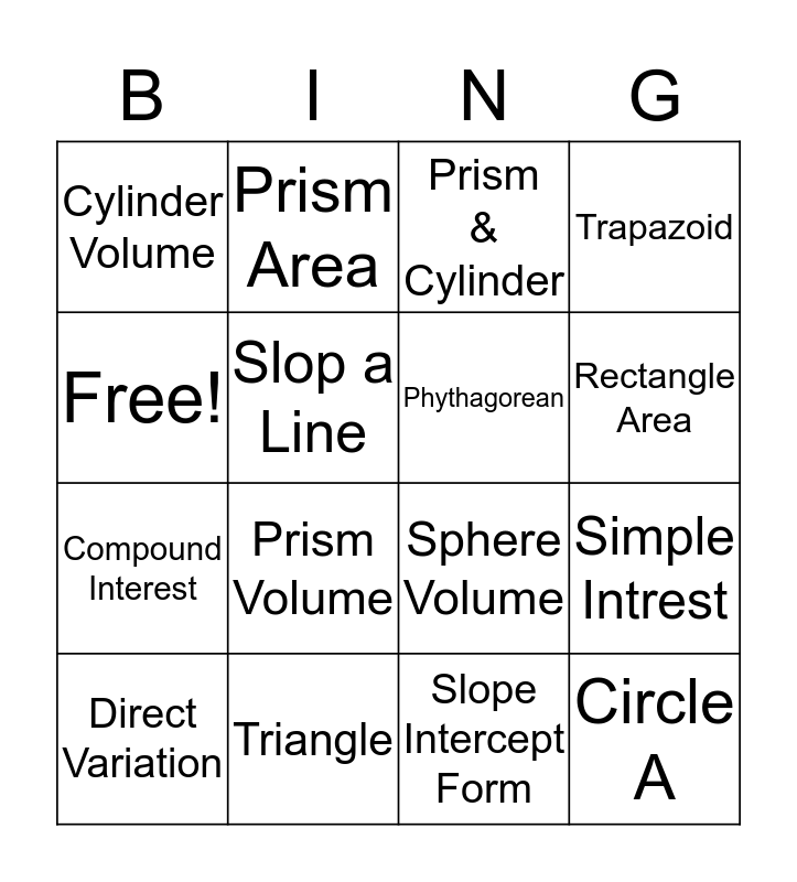 This bingo card has 16 words: Triangle, Simple Intrest, Prism & Cylinder, Cylinder Volume, Compound Interest, Prism Area, Sphere Volume, Slope Intercept Form, Free!, Slop a Line, Direct Variation, Trapazoid, Prism Volume, Rectangle Area, Phythagorean and Circle A.