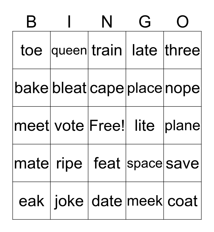 This bingo card has a free space and 24 words: ripe, joke, cape, eak, three, toe, bake, queen, lite, feat, place, meet, space, save, bleat, meek, plane, train, nope, vote, coat, mate, late and date.