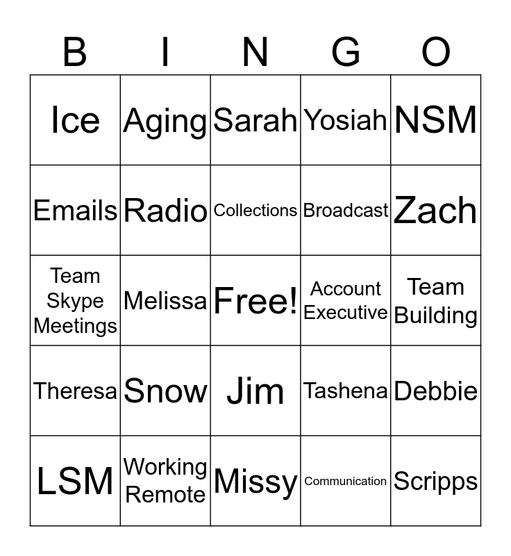This bingo card has a free space and 24 words: Snow, Working Remote, Collections, LSM, NSM, Ice, Emails, Aging, Account Executive, Jim, Broadcast, Team Skype Meetings, Tashena, Debbie, Radio, Communication, Team Building, Sarah, Zach, Melissa, Scripps, Theresa, Yosiah and Missy.
