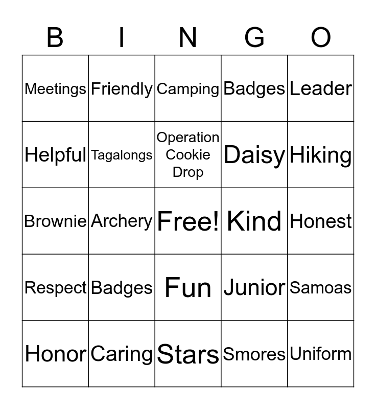 This bingo card has a free space and 24 words: Badges, Caring, Operation Cookie Drop, Honor, Leader, Meetings, Helpful, Friendly, Kind, Fun, Daisy, Brownie, Junior, Samoas, Tagalongs, Smores, Honest, Camping, Hiking, Archery, Uniform, Respect, Badges and Stars.