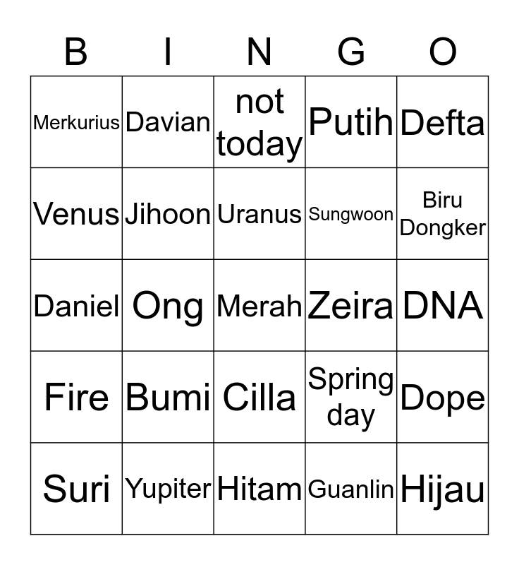 This bingo card has a free space and 24 words: Bumi, Yupiter, Uranus, Suri, Defta, Merkurius, Venus, Davian, Zeira, Cilla, Sungwoon, Daniel, Spring day, Dope, Jihoon, Guanlin, DNA, not today, Biru Dongker, Ong, Hijau, Fire, Putih and Hitam.