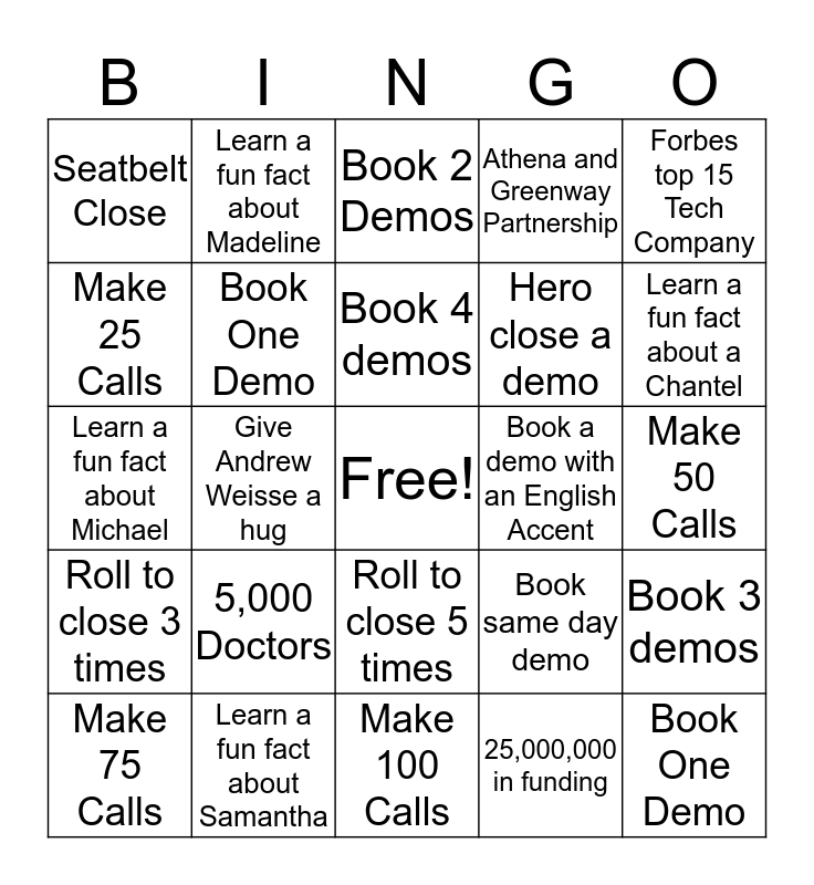 This bingo card has a free space and 24 words: 5,000 Doctors, Learn a fun fact about Samantha, Book 4 demos, Make 75 Calls, Forbes top 15 Tech Company, Seatbelt Close, Make 25 Calls, Learn a fun fact about Madeline, Book a demo with an English Accent, Roll to close 5 times, Hero close a demo, Learn a fun fact about Michael, Book same day demo, Book 3 demos, Book One Demo, 25,000,000 in funding, Make 50 Calls, Book 2 Demos, Learn a fun fact about a Chantel, Give Andrew Weisse a hug, Book One Demo, Roll to close 3 times, Athena and Greenway Partnership and Make 100 Calls.