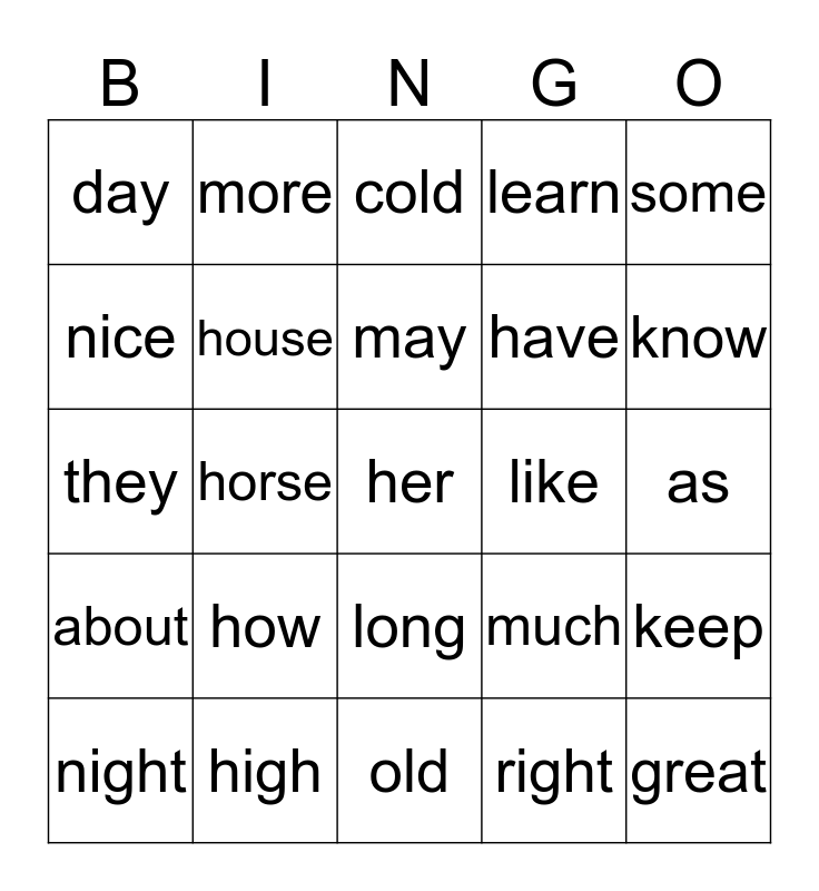 This bingo card has 25 words: how, old, may, night, some, day, nice, more, like, long, have, they, much, keep, house, great, as, cold, know, horse, her, high, about, learn and right.
