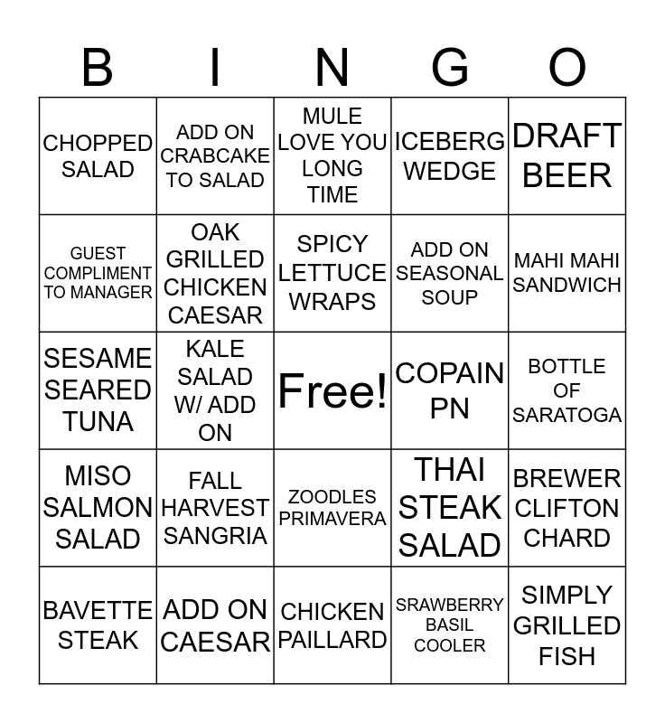 This bingo card has a free space and 24 words: FALL HARVEST SANGRIA, ADD ON CAESAR, SPICY LETTUCE WRAPS, BAVETTE STEAK, DRAFT BEER, CHOPPED SALAD, GUEST COMPLIMENT TO MANAGER, ADD ON CRABCAKE TO SALAD, COPAIN PN, ZOODLES PRIMAVERA, ADD ON SEASONAL SOUP, SESAME SEARED TUNA, THAI STEAK SALAD, BREWER CLIFTON CHARD, OAK GRILLED CHICKEN CAESAR, SRAWBERRY BASIL COOLER, BOTTLE OF SARATOGA, MULE LOVE YOU LONG TIME, MAHI MAHI SANDWICH, KALE SALAD W/ ADD ON, SIMPLY GRILLED FISH, MISO SALMON SALAD, ICEBERG WEDGE and CHICKEN PAILLARD.