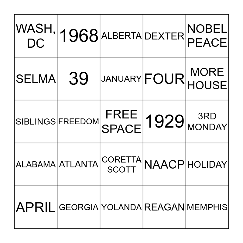This bingo card has a free space and 24 words: ATLANTA, GEORGIA, JANUARY, APRIL, NOBEL PEACE, WASH, DC, SELMA, 1968, 1929, CORETTA SCOTT, FOUR, SIBLINGS, NAACP, HOLIDAY, 39, REAGAN, 3RD MONDAY, ALBERTA, MORE HOUSE, FREEDOM, MEMPHIS, ALABAMA, DEXTER and YOLANDA.