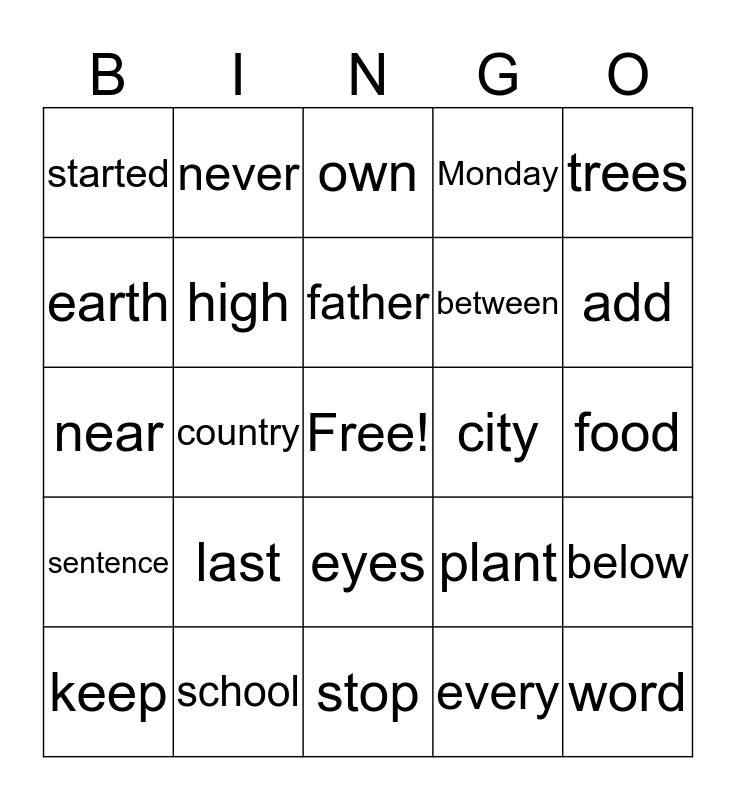This bingo card has a free space and 24 words: last, school, father, keep, trees, started, earth, never, city, eyes, between, near, plant, below, high, every, food, own, add, country, word, sentence, Monday and stop.