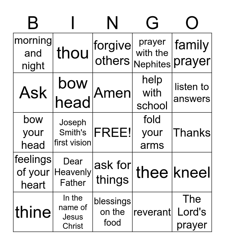 This bingo card has a free space and 24 words: Dear Heavenly Father, In the name of Jesus Christ, Amen, thine, family prayer, morning and night, Ask, thou, fold your arms, ask for things, help with school, bow your head, thee, kneel, bow head, reverant, Thanks, forgive others, listen to answers, Joseph Smith's first vision, The Lord's prayer, feelings of your heart, prayer with the Nephites and blessings on the food.