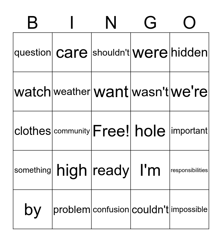 This bingo card has a free space and 24 words: high, problem, want, by, hidden, question, watch, care, hole, ready, wasn't, clothes, I'm, responsibilities, weather, couldn't, important, shouldn't, we're, community, impossible, something, were and confusion.