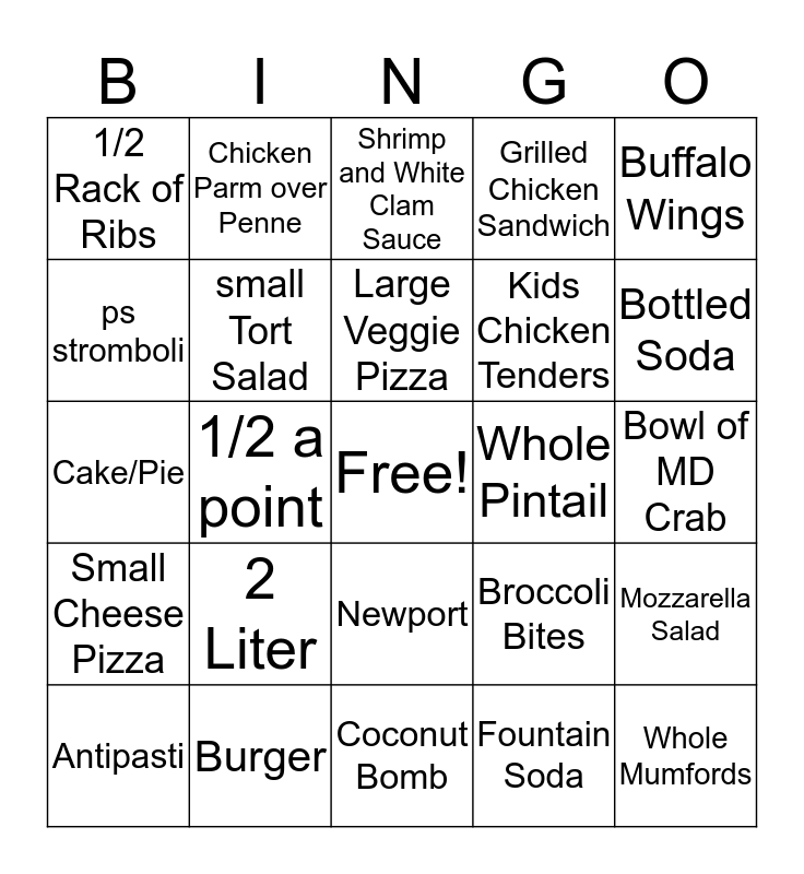This bingo card has a free space and 24 words: 2 Liter, Burger, Large Veggie Pizza, Antipasti, Buffalo Wings, 1/2 Rack of Ribs, ps stromboli, Chicken Parm over Penne, Whole Pintail, Newport, Kids Chicken Tenders, Cake/Pie, Broccoli Bites, Mozzarella Salad, small Tort Salad, Fountain Soda, Bowl of MD Crab, Shrimp and White Clam Sauce, Bottled Soda, 1/2 a point, Whole Mumfords, Small Cheese Pizza, Grilled Chicken Sandwich and Coconut Bomb.
