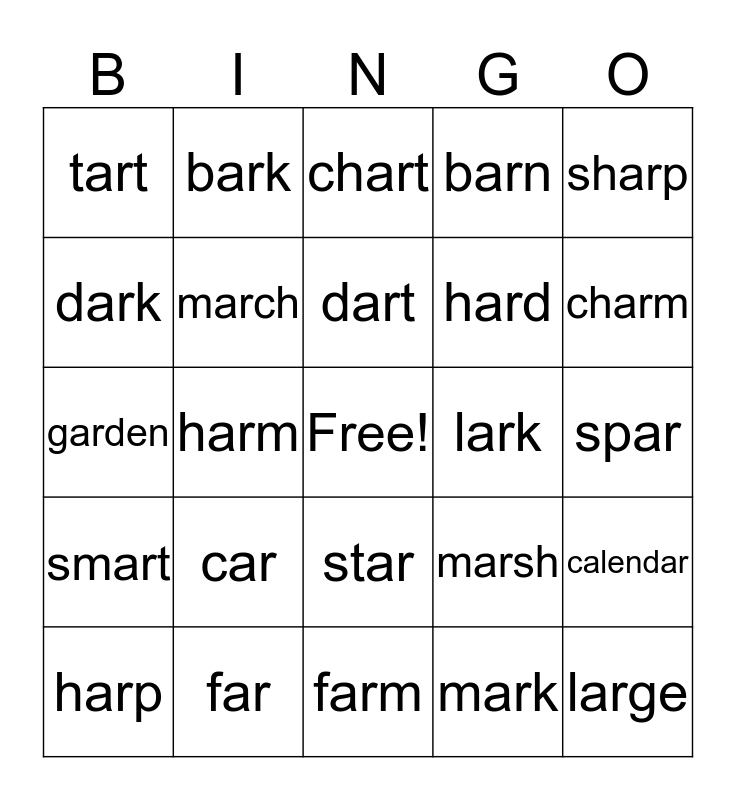 This bingo card has a free space and 24 words: car, far, dart, harp, sharp, tart, dark, bark, lark, star, hard, garden, marsh, calendar, march, mark, spar, chart, charm, harm, large, smart, barn and farm.
