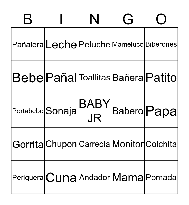 This bingo card has a free space and 24 words: Chupon, Cuna, Toallitas, Periquera, Biberones, Pañalera, Bebe, Leche, Babero, Carreola, Bañera, Portabebe, Monitor, Colchita, Pañal, Mama, Papa, Peluche, Patito, Sonaja, Pomada, Gorrita, Mameluco and Andador.