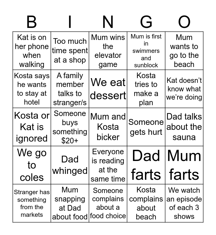This bingo card has a free space and 24 words: Dad whinged, Mum snapping at Dad about food, We eat dessert, Stranger has something from the markets, Mum wants to go to the beach, Kat is on her phone when walking, Kosta says he wants to stay at hotel, Too much time spent at a shop, Someone gets hurt, Everyone is reading at the same time, Kosta tries to make a plan, Kosta or Kat is ignored, Dad farts, Mum farts, A family member talks to stranger/s, Kosta complains about beach, Dad talks about the sauna, Mum wins the elevator game, Kat doesn’t know what we’re doing, Someone buys something $20+, We watch an episode of each 3 shows, We go to coles, Mum is first in swimmers and sunblock and Someone complains about a food choice.