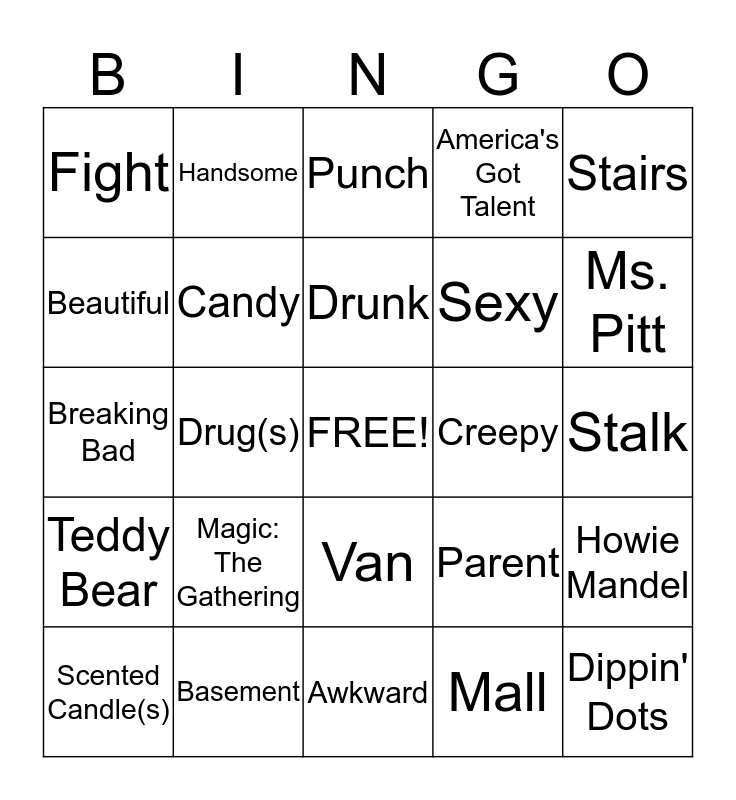 This bingo card has a free space and 30 words: Basement, Kids, Drug(s), Bullshit, Fight, Punch, Candy, Van, Creepy, Awkward, Stalk, Dippin' Dots, Mall, Date, Ms. Pitt, My Little Angel, Parent, Teddy Bear, Magic: The Gathering, Stairs, Breaking Bad, Stupid, Handsome, Sexy, Beautiful, America's Got Talent, Howie Mandel, Scented Candle(s), Drunk and Tipsy.