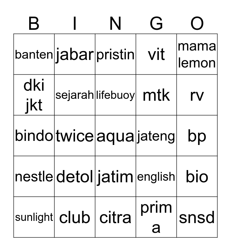 This bingo card has 25 words: detol, citra, lifebuoy, sunlight, mama lemon, banten, dki jkt, jabar, jateng, jatim, mtk, bindo, english, bio, sejarah, snsd, bp, pristin, rv, twice, aqua, club, nestle, vit and prim a.
