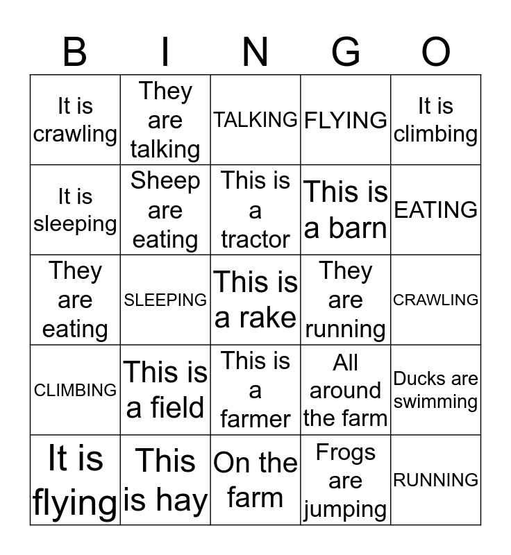 This bingo card has a free space and 24 words: This is a field, This is hay, This is a tractor, It is flying, It is climbing, It is crawling, It is sleeping, They are talking, They are running, This is a farmer, This is a barn, They are eating, All around the farm, Ducks are swimming, Sheep are eating, Frogs are jumping, CRAWLING, TALKING, EATING, SLEEPING, RUNNING, CLIMBING, FLYING and On the farm.