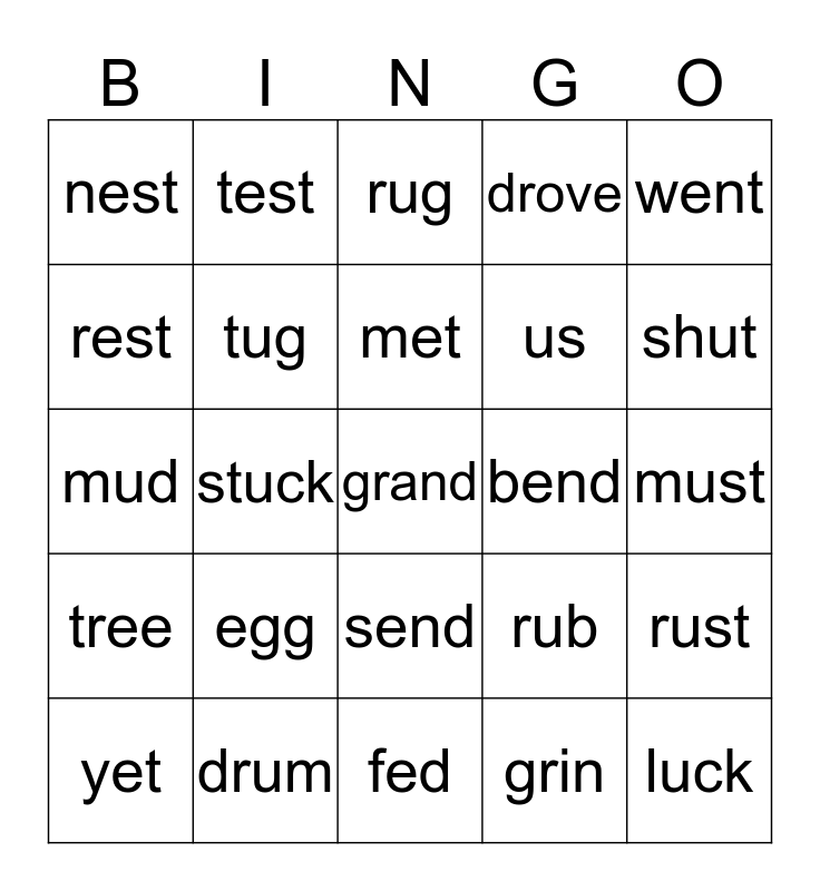 This bingo card has 25 words: egg, fed, met, yet, went, nest, rest, test, bend, send, us, mud, rub, rust, tug, luck, must, rug, shut, stuck, grand, drum, tree, drove and grin.