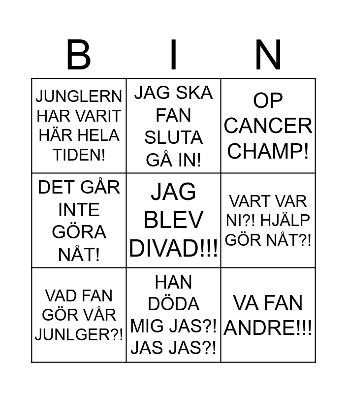This bingo card has 9 words: VAD FAN GÖR VÅR JUNLGER?!, OP CANCER CHAMP!, JAG SKA FAN SLUTA GÅ IN!, DET GÅR INTE GÖRA NÅT!, JUNGLERN HAR VARIT HÄR HELA TIDEN!, VART VAR NI?! HJÄLP GÖR NÅT?!, JAG BLEV DIVAD!!!, VA FAN ANDRE!!! and HAN DÖDA MIG JAS?! JAS JAS?!.