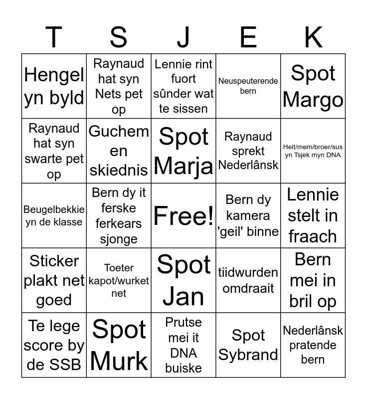 This bingo card has a free space and 26 words: Spot Jan, Spot Sybrand, Spot Marja, Spot Murk, Spot Margo, Hengel yn byld, Raynaud hat syn swarte pet op, Raynaud hat syn Nets pet op, Lennie stelt in fraach, tiidwurden omdraait, Raynaud sprekt Nederlânsk, Beugelbekkie yn de klasse, Bern mei in bril op, Te lege score by de SSB, Bern dy it ferske ferkears sjonge, Lennie filmt thûs, Neuspeuterende bern, Sticker plakt net goed, Lennie rint fuort sûnder wat te sissen, Nederlânsk pratende bern, Heit/mem/broer/sus yn Tsjek myn DNA, Prutse mei it DNA buiske, Bern dy kamera 'geil' binne, Toeter kapot/wurket net, Guchem en skiednis and Raynaud super close-up.