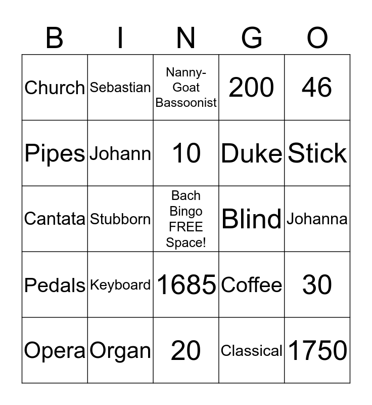 This bingo card has a free space and 24 words: Keyboard, Organ, 10, Opera, 46, Church, Pipes, Sebastian, Blind, 1685, Duke, Cantata, Coffee, 30, Johann, Classical, Johanna, Nanny-Goat Bassoonist, Stick, Stubborn, 1750, Pedals, 200 and 20.