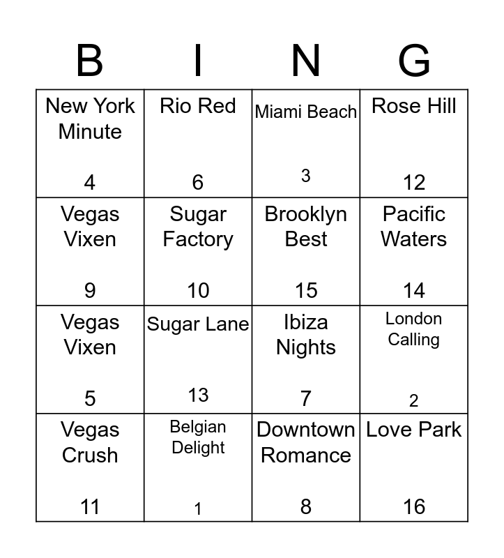 This bingo card has 16 words: Belgian Delight 1, London Calling 2, Miami Beach 3, New York Minute 4, Vegas Vixen 5, Rio Red 6, Ibiza Nights 7, Downtown Romance 8, Vegas Vixen 9, Sugar Factory 10, Vegas Crush 11, Rose Hill 12, Sugar Lane 13, Pacific Waters 14, Brooklyn Best 15 and Love Park 16.