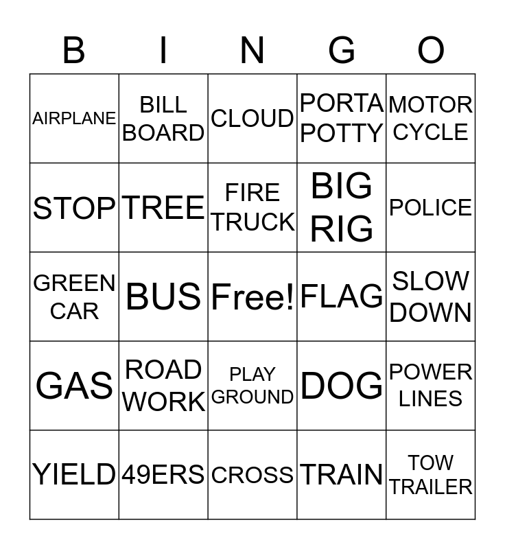 This bingo card has a free space and 24 words: ROAD WORK, 49ERS, FIRE TRUCK, YIELD, MOTOR CYCLE, AIRPLANE, STOP, BILL BOARD, FLAG, PLAY GROUND, BIG RIG, GREEN CAR, DOG, POWER LINES, TREE, TRAIN, SLOW DOWN, CLOUD, POLICE, BUS, TOW TRAILER, GAS, PORTA POTTY and CROSS.
