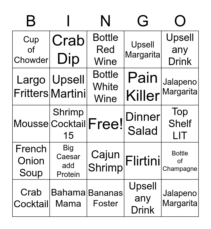 This bingo card has a free space and 24 words: Big Caesar add Protein, Bahama Mama, Bottle White Wine, Crab Cocktail, Upsell any Drink, Cup of Chowder, Largo Fritters, Crab Dip, Dinner Salad, Cajun Shrimp, Pain Killer, Mousse, Flirtini, Bottle of Champagne, Upsell Martini, Upsell any Drink, Top Shelf LIT, Bottle Red Wine, Jalapeno Margarita, Shrimp Cocktail 15, Jalapeno Margarita, French Onion Soup, Upsell Margarita and Bananas Foster.