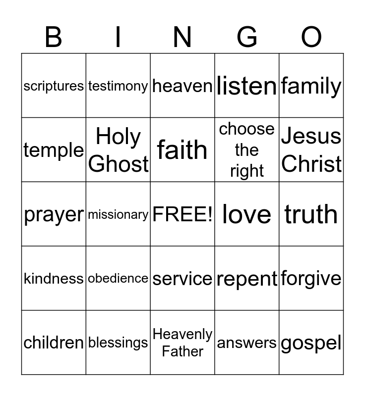 This bingo card has a free space and 24 words: obedience, blessings, faith, children, family, scriptures, temple, testimony, love, service, choose the right, prayer, repent, forgive, Holy Ghost, answers, truth, heaven, Jesus Christ, missionary, gospel, kindness, listen and Heavenly Father.