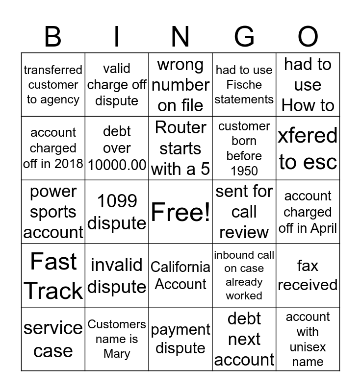 This bingo card has a free space and 24 words: invalid dispute, Customers name is Mary, Router starts with a 5, service case, had to use How to, transferred customer to agency, account charged off in 2018, valid charge off dispute, sent for call review, California Account, customer born before 1950, power sports account, inbound call on case already worked, fax received, debt over 10000.00, debt next account, account charged off in April, wrong number on file, xfered to esc, 1099 dispute, account with unisex name, Fast Track, had to use Fische statements and payment dispute.