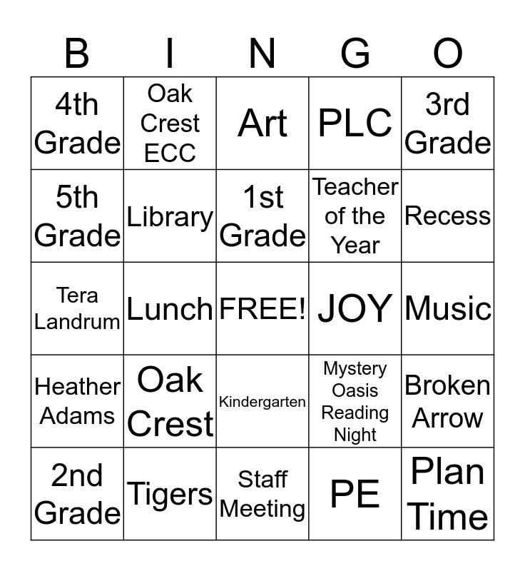 This bingo card has a free space and 24 words: Oak Crest, Tigers, 1st Grade, 2nd Grade, 3rd Grade, 4th Grade, 5th Grade, Oak Crest ECC, JOY, Kindergarten, Teacher of the Year, Tera Landrum, Mystery Oasis Reading Night, Broken Arrow, Library, PE, Music, Art, Recess, Lunch, Plan Time, Heather Adams, PLC and Staff Meeting.