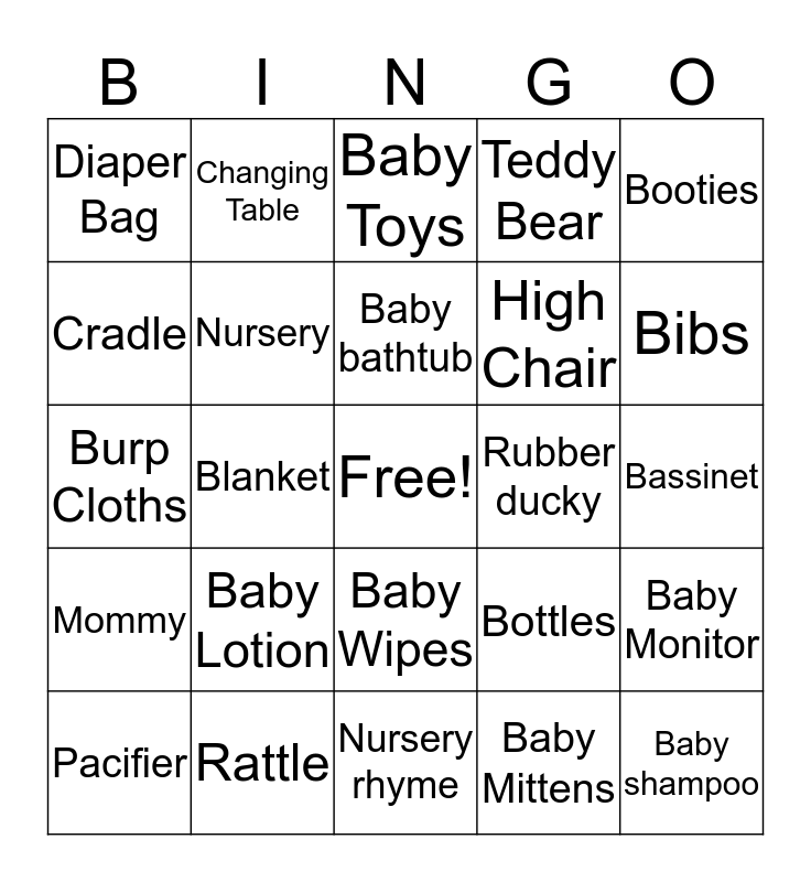 This bingo card has a free space and 42 words: Baby, Baby bathtub, Baby hat, Baby Lotion, Baby Mittens, Baby Monitor, Baby shampoo, Baby Swing, Baby Toys, Baby Wipes, Bassinet, Bibs, Blanket, Booties, Bottle Warmer, Bottles, Bouncer, Burp Cloths, Car Seat, Changing Table, Cradle, Crib, Daddy, Diaper Bag, Diapers, Family, High Chair, Infant Carrier, Instant Formula, Lullaby, Milk, Mommy, Nursery, Nursery rhyme, Onesies, Pacifier, Rattle, Rubber ducky, Stork, Stroller, Teddy Bear and Teether.