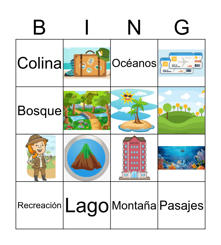 This bingo card has 12 images and 12 words: Desierto, Equipaje, Bosque, Colina, Lago, Isla, Hotel, Guía Turístico, Montaña, Océanos, Recreación and Pasajes.