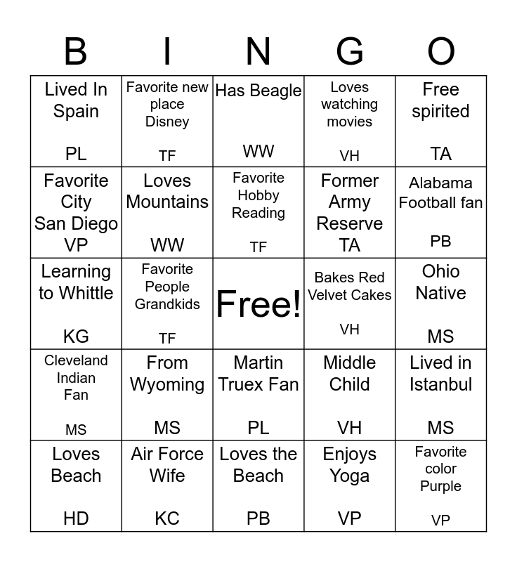 This bingo card has a free space and 24 words: From Wyoming MS, Air Force Wife KC, Favorite Hobby Reading TF, Loves Beach HD, Free spirited TA, Lived In Spain PL, Favorite City San Diego VP, Favorite new place Disney TF, Bakes Red Velvet Cakes VH, Martin Truex Fan PL, Former Army Reserve TA, Learning to Whittle KG, Middle Child VH, Lived in Istanbul MS, Loves Mountains WW, Enjoys Yoga VP, Ohio Native MS, Has Beagle WW, Alabama Football fan PB, Favorite People Grandkids TF, Favorite color Purple VP, Cleveland Indian Fan MS, Loves watching movies VH and Loves the Beach PB.