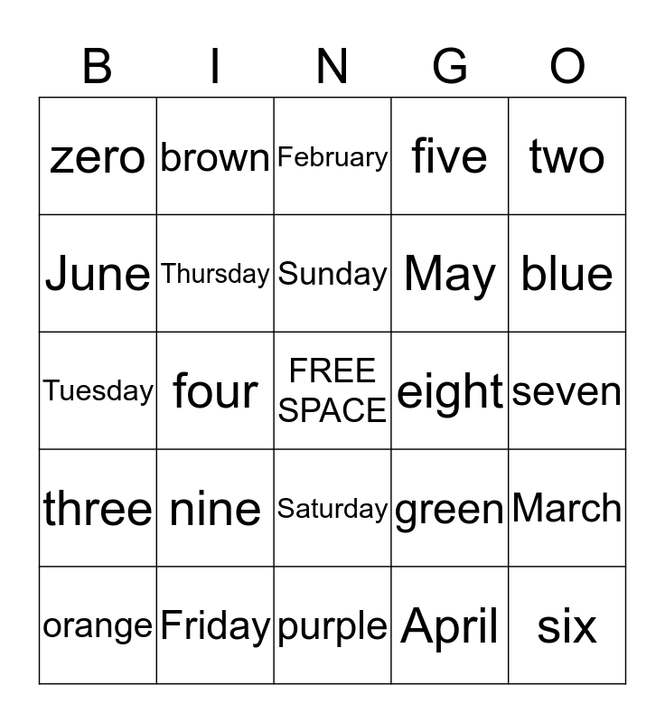 This bingo card has a free space and 40 words: Monday, Tuesday, Wednesday, Thursday, Friday, Saturday, Sunday, one, two, three, four, five, six, seven, eight, nine, ten, zero, January, February, March, April, May, June, July, August, September, October, November, December, red, orange, yellow, green, blue, purple, pink, black, brown and white.