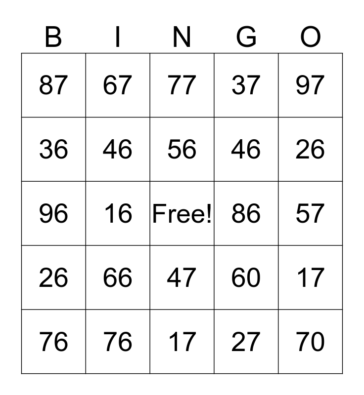 This bingo card has a free space and 24 words: 66, 76, 56, 76, 97, 87, 36, 67, 86, 47, 46, 96, 60, 17, 46, 27, 57, 77, 26, 16, 70, 26, 37 and 17.