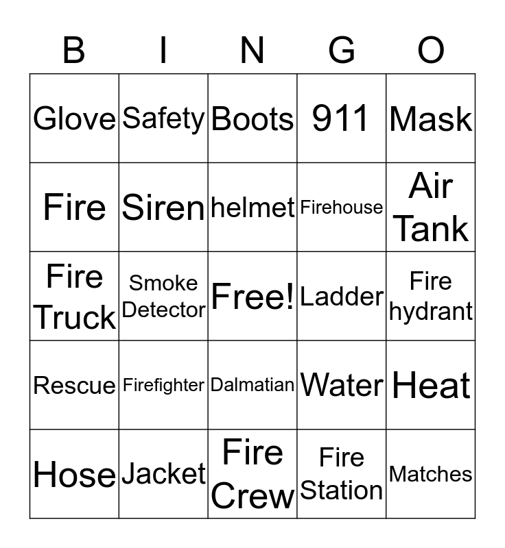 This bingo card has a free space and 24 words: Firefighter, Jacket, helmet, Hose, Mask, Glove, Fire, Safety, Ladder, Dalmatian, Firehouse, Fire Truck, Water, Heat, Siren, Fire Station, Fire hydrant, Boots, Air Tank, Smoke Detector, Matches, Rescue, 911 and Fire Crew.