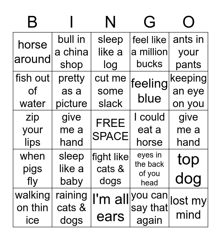 This bingo card has a free space and 24 words: sleep like a baby, raining cats & dogs, cut me some slack, walking on thin ice, ants in your pants, horse around, fish out of water, bull in a china shop, I could eat a horse, fight like cats & dogs, feeling blue, zip your lips, eyes in the back of you head, top dog, pretty as a picture, you can say that again, give me a hand, sleep like a log, keeping an eye on you, give me a hand, lost my mind, when pigs fly, feel like a million bucks and I'm all ears.
