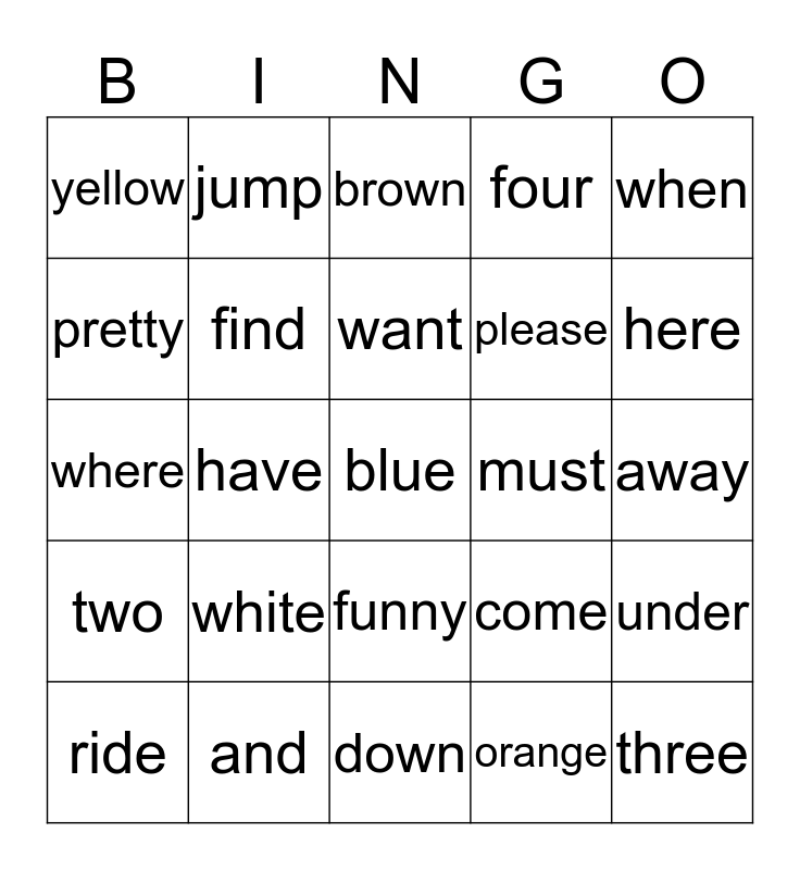 This bingo card has 30 words: and, the, have, make, yellow, brown, find, funny, must, down, away, blue, orange, three, here, said, come, two, white, when, where, help, jump, please, pretty, four, under, ride, want and with.