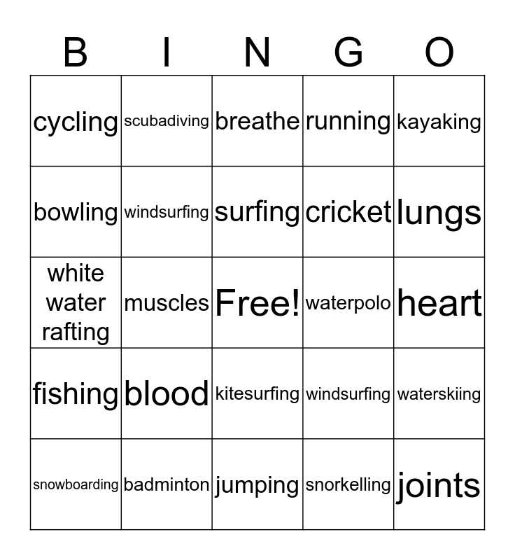 This bingo card has a free space and 24 words: blood, badminton, surfing, snowboarding, kayaking, cycling, bowling, scubadiving, waterpolo, kitesurfing, cricket, white water rafting, windsurfing, waterskiing, windsurfing, snorkelling, heart, breathe, lungs, muscles, joints, fishing, running and jumping.
