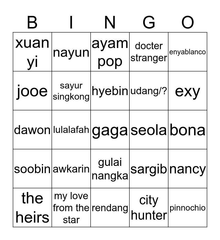 This bingo card has 25 words: awkarin, rendang, hyebin, the heirs, enyablanco, xuan yi, jooe, nayun, seola, gulai nangka, udang/?, dawon, sargib, nancy, sayur singkong, pinnochio, bona, ayam pop, exy, lulalafah, gaga, my love from the star, soobin, docter stranger and city hunter.